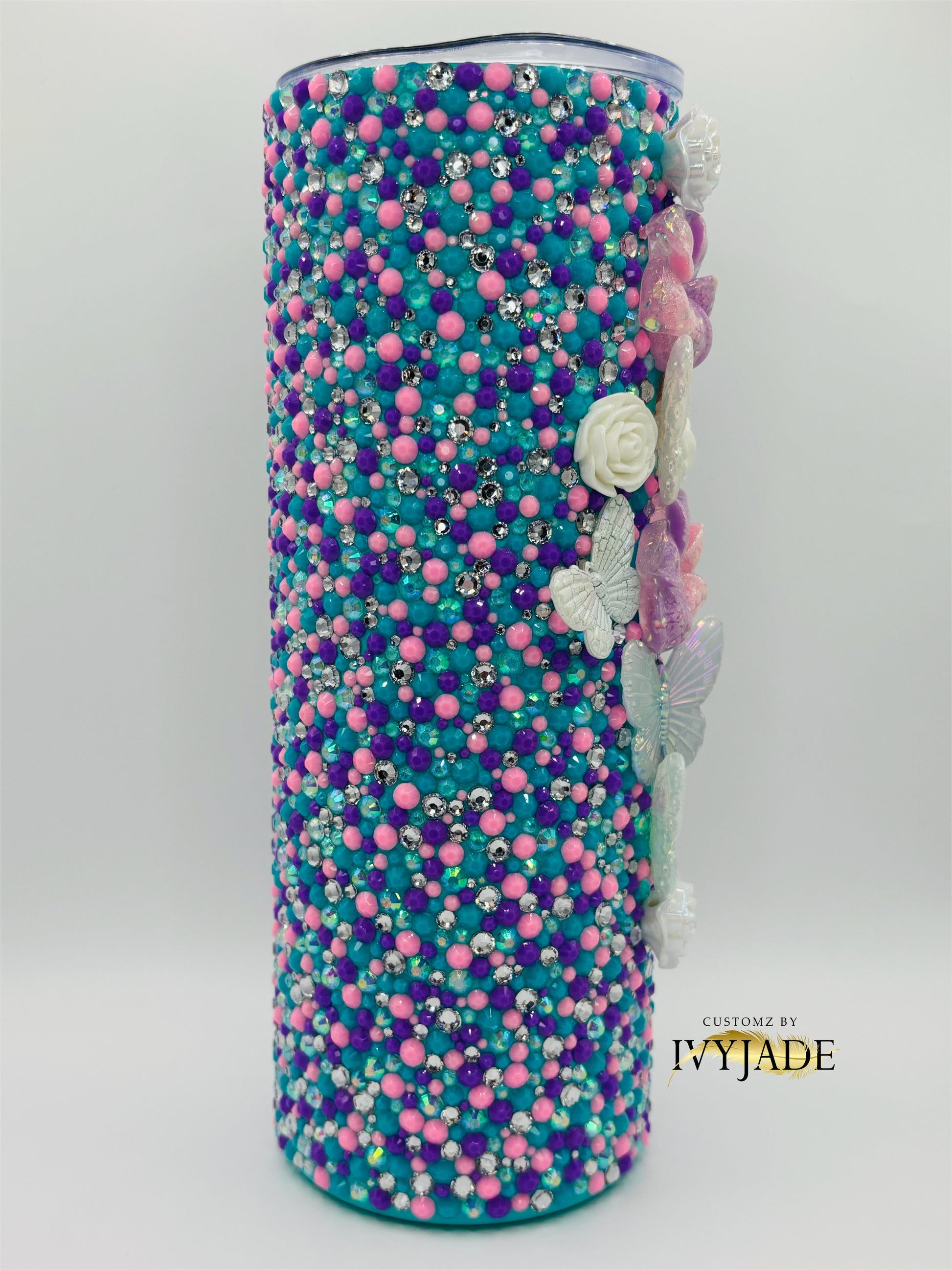This butterfly garden pink and teal rhinestone tumbler is a must have! This is a rhinestone tumbler with pink, teal, purple and iridescent rhinestones added individually by hand. beautiful iridescent roses and butterfly’s are the “main attraction” of this rhinestone tumbler. Tumbler is double insulated keeping drinks at temperature